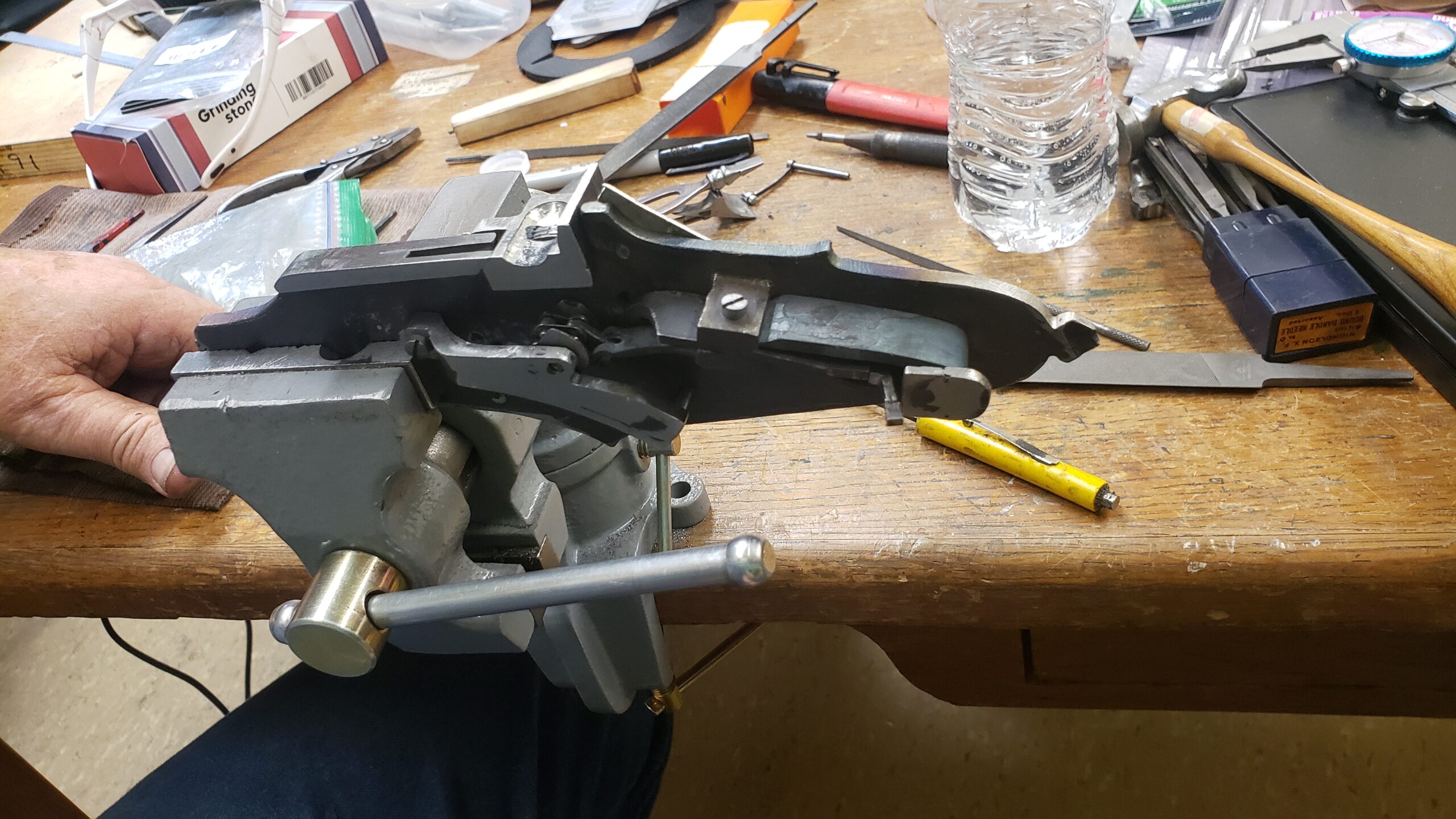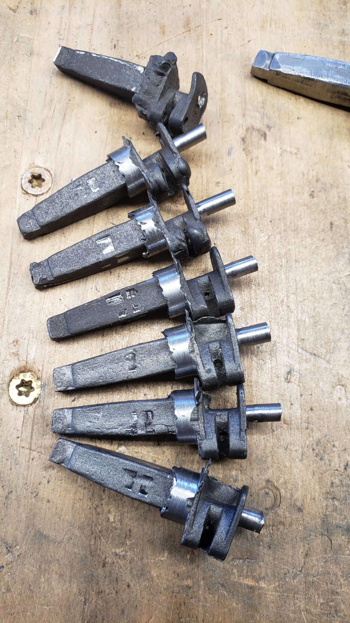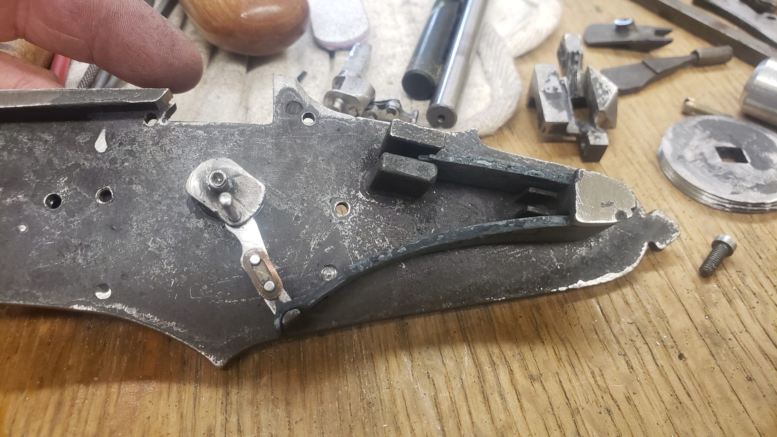 The 9 day class was barely enough time to get a functioning wheellock mechanism built. There were some issues with the castings from the foundry. (See the write up here.) The material was not a consistent density and also contained hardened particles embedded. We broke a few taps also. Most of the springs that were hardened & tempered in a temperature controlled furnace repeatedly failed. There were voids in the castings. Pin holes and channels.